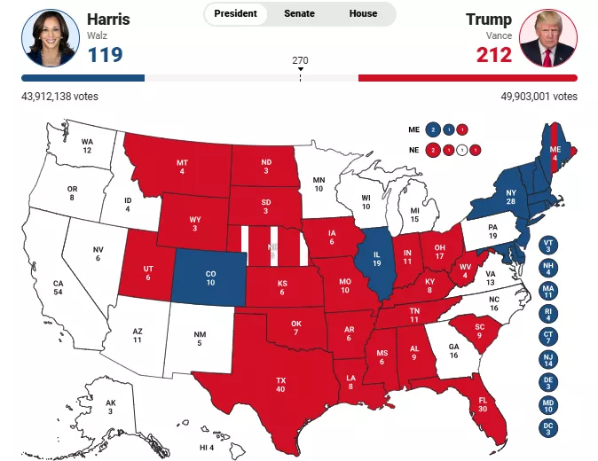 4:50 - Donald Trump dostigao je 212 elektorskih glasova prema prvim rezultatima, a njegova protivnica Kamala Harris trenutno je na 119 elektorskih glasova.
