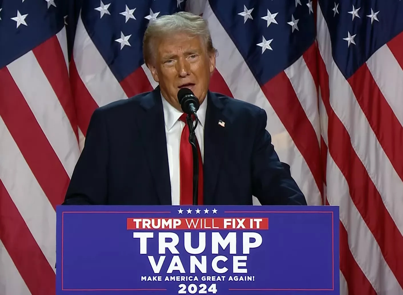 “Ovo je jedan veliki pokret. Nikad niko nije vidio veći pokret. Prevladali smo prepreke za koje su mnogi mislili da ih nećemo prevladati. Riječ je o političkoj pobjedi koju naša zemlja nije vidjela. Zato želim zahvaliti američkom narodu jer sam 45. i 47. američki predsjednik. Borit ću se za vas svakim danom, svakim dahom. Neću stati dok ne napravimo sigurnu Ameriku za svakog od vas. Bit će to zlatno doba Amerike i Amerika će opet postati velika”, poručio je novi američki predsjednik Donald Trump, koji je pobijedio u utrci za predsjednika SAD.