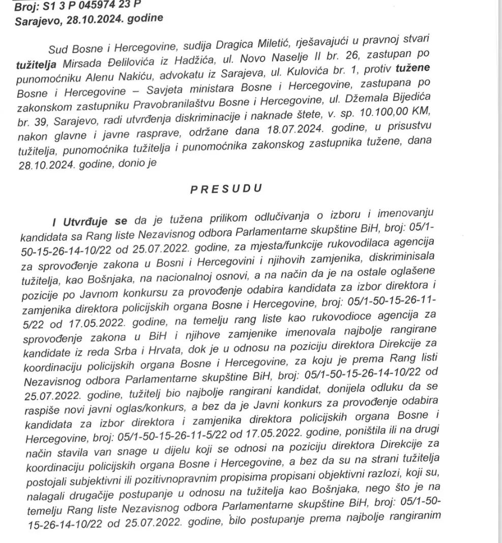 Nakon što je u javnosti objavljena informacija da je Sud BiH donio prvostepenu presudu kojom je utvrđeno da je nekadašnji visoki policijski dužnosnik Uprave policije MUP-a Kantona Sarajevo Mirsad Đelilović diskriminiran od strane Vijeća ministara BiH na nacionalnoj osnovi, kao Bošnjak, u konkursnoj proceduri za izbor i imenovanje rukovodilaca i zamjenika rukovodilaca agencija za sprovođenje zakona na nivou BiH, kontaktirali smo njegovog advokata Alena Nakića koji je u razgovoru za Patriju potvrdio navedenu informaciju.