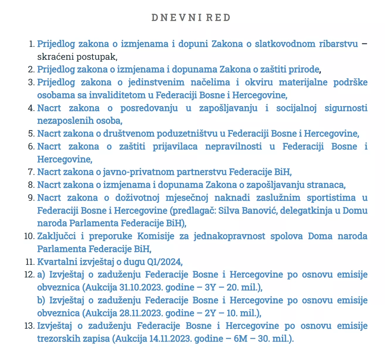 Na dnevnom redu su i: Prijedlog zakona o izmjenama i dopuni Zakona o slatkovodnom ribarstvu (skraćeni postupak); Prijedlog zakona o izmjenama i dopunama Zakona o zaštiti prirode; Prijedlog zakona o jedinstvenim načelima i okviru materijalne podrške osobama s invaliditetom u FBiH; Nacrt zakona o posredovanju u zapošljavanju i socijalnoj sigurnosti nezaposlenih osoba.