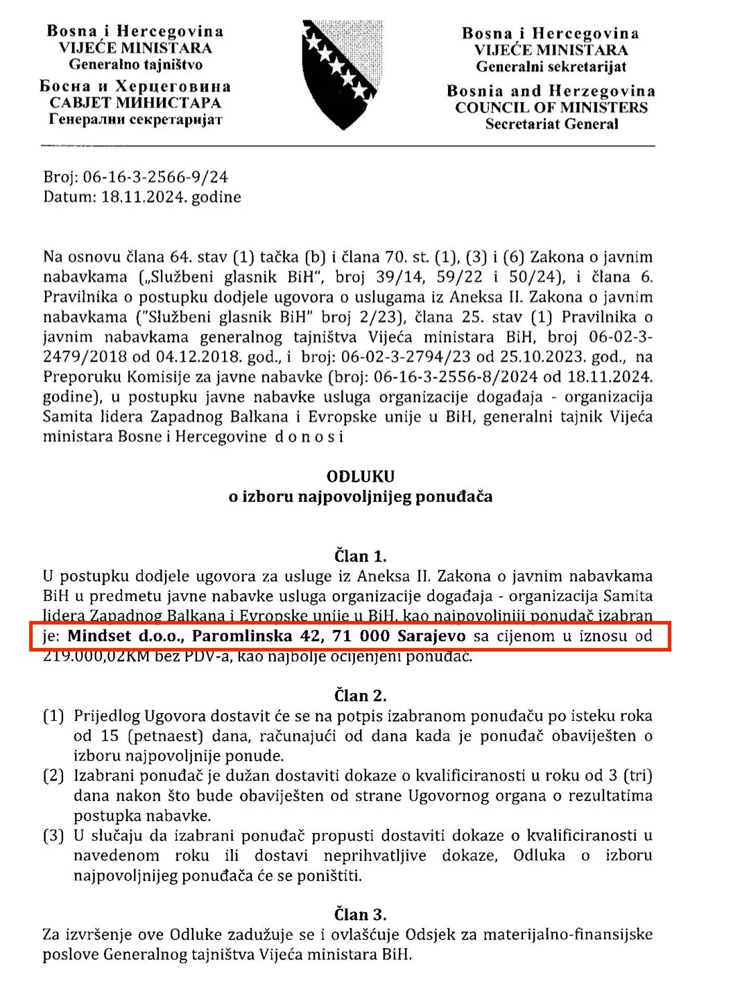 “Na preporuku Komisije za javne nabavke, od 18. 11. 2024. godine, generalni tajnik Vijeća ministara BiH donosi Odluku o izboru najpovoljnijeg ponuđača u predmetu javne nabavke usluga organizacija događaja – Organizacija Samita lidera Zapadnog Balkana i EU u BiH, kao najpovoljniji ponuđač izabran je: Mindset d.o.o., Parolmlinska 42, sa cijenom u iznosu od 219 hiljada KM, bez PDV-a”, navedeno je u Odluci generalnog sekretara Vijeća ministara BiH Roberta Vidovića.