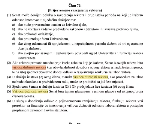Posljednja odluka koju je Senat donio u vezi izbora rektora bila je 30.09.2024. godine kada je potvrđeno da je sve urađeno u skladu sa zakonom.