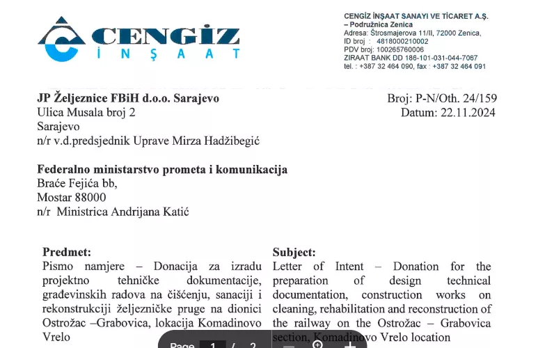 (Patria) - Na adresu Željeznica FBiH i Ministarstva prometa i komunikacija FBiH stiglo je pismo namjere firme Çengiz Insaata u kojem nude donaciju saniranja pruge.