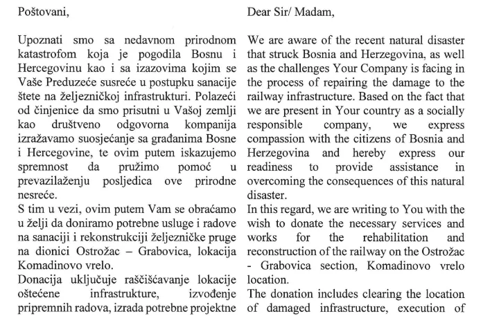 “Upoznati smo sa nedavnom prirodnom katastrofom koja je pogodila Bosnu i Hercegovinu kao i sa izazovima kojim se Vaše Preduzeće susreće u postupku sanacije štete na željezničkoj infrastrukturi.