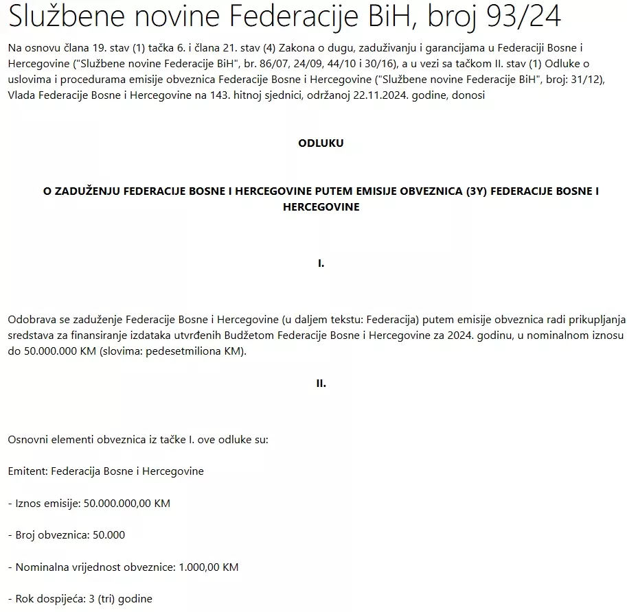 U pitanju su tri odluke Vlade FBiH. Prva odluka se odnosi na zaduženje od 50 miliona KM s rokom dospijeća od tri godine, odnosno nakon 2026. godine.