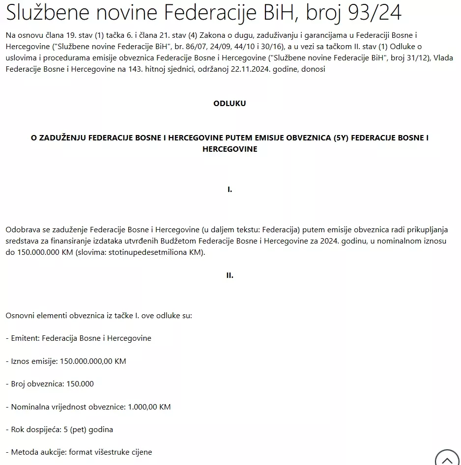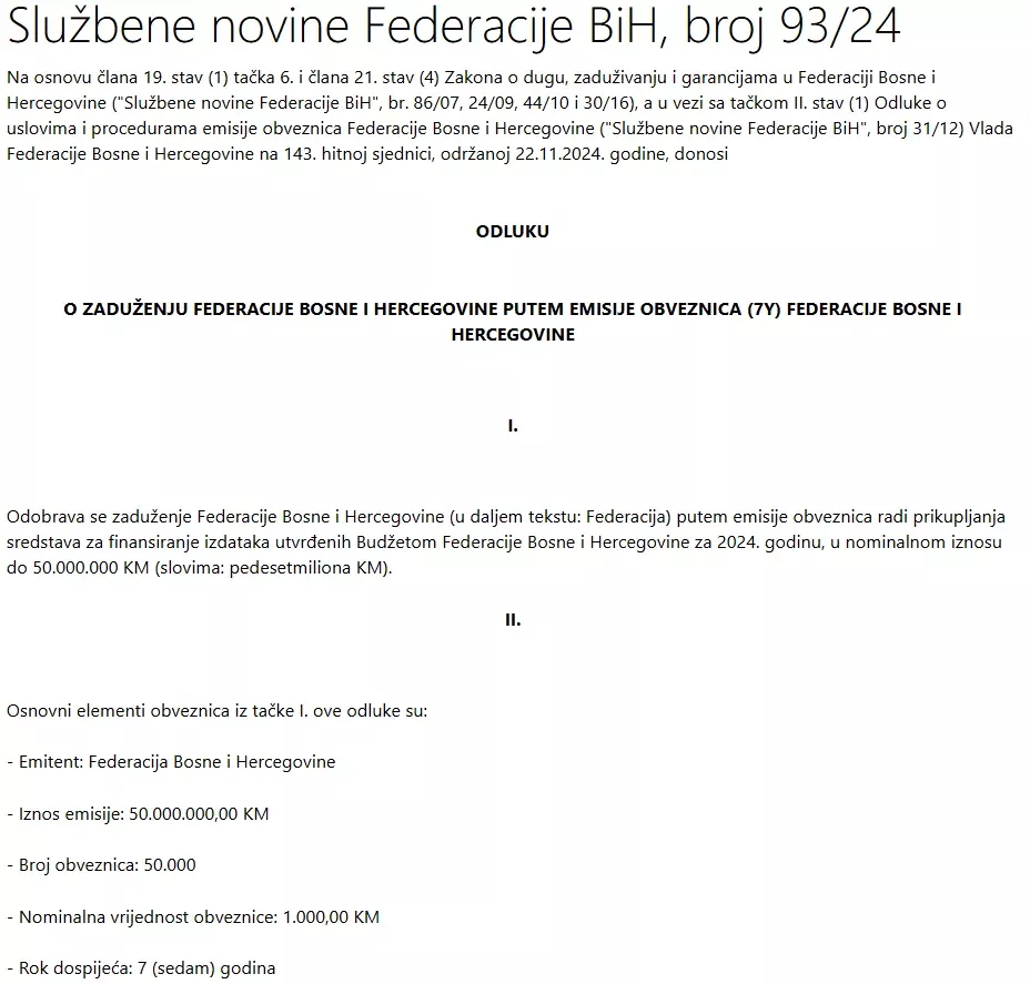(Patria) - Vlada Federacije BiH zadužit će se putem emisije obveznica za dodatnih 250 miliona KM odlučeno je na hitnoj sjednici održanoj 22.11.2024. godine, piše Istraga.ba.