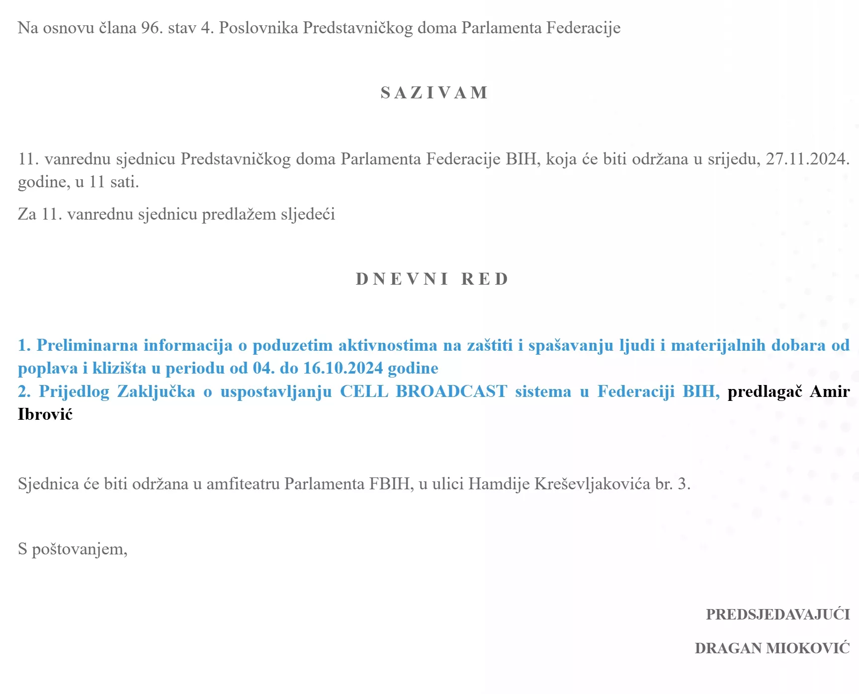 Na inicijativu zastupnika Amira Ibrovića, za dnevni red je predložen i zaključak o uspostavi Cell Broadcast sistema u FBiH, koji se koristi za slanje poruka korisnicima mobilnih uređaja u slučaju prirodnih katastrofa i drugih vanrednih situacija s ciljem blagovremenog uzbunjivanja, instruiranja, informisanja i zaštite stanovništva.