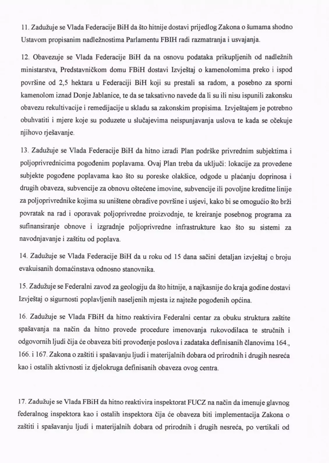 - Zadužuje se Vlada FBiH da nastavi osiguravati materijalnu i svaku dugu pomoć stanovništvu pogođenom poplavama uključujući smještaj, hranu, vodu, lijekove i svu drugu neophodnu pomoć.