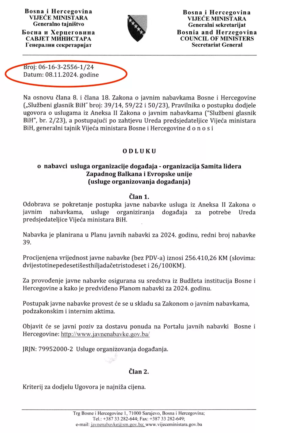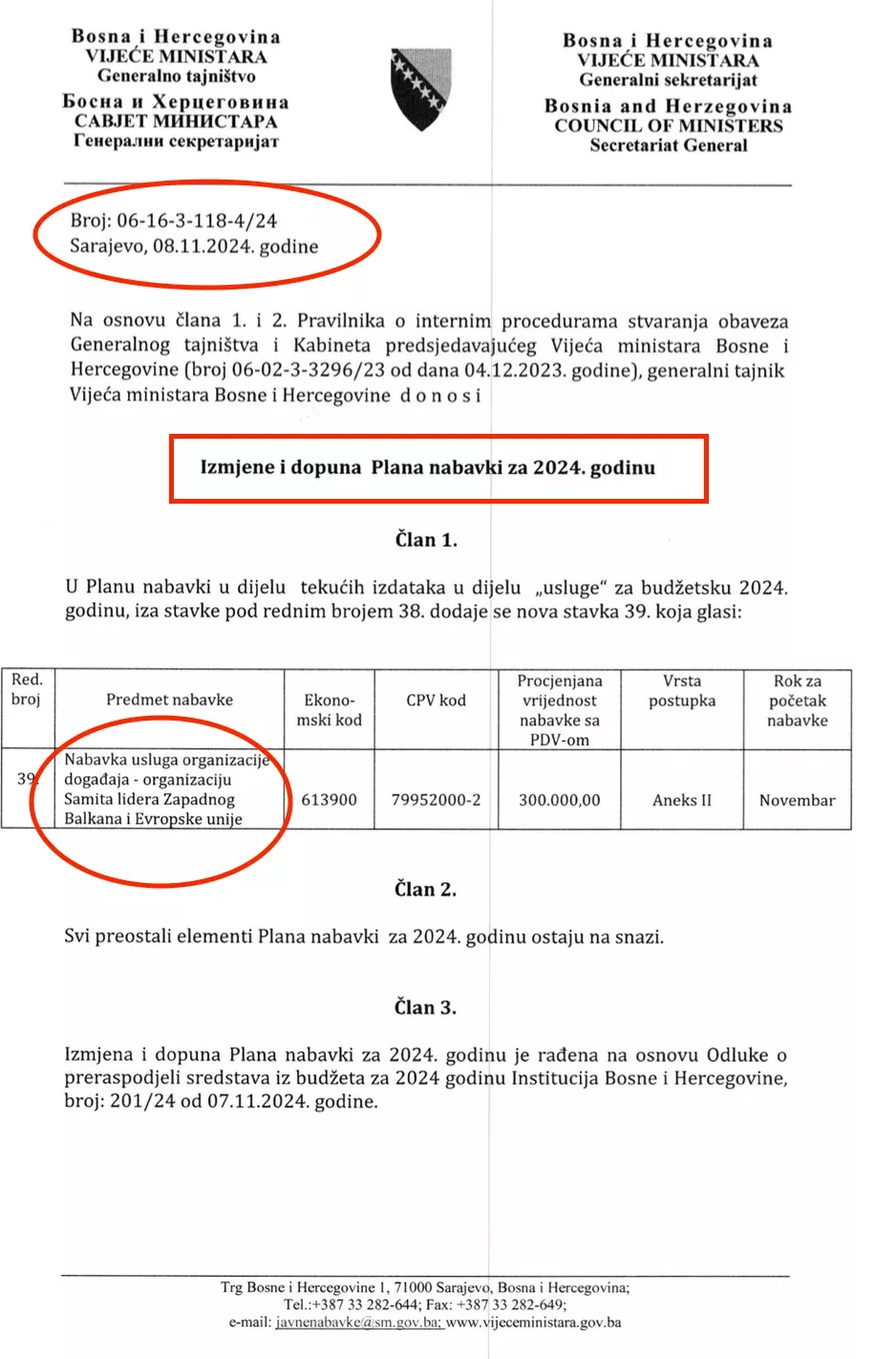 Kako se može vidjeti u ovom dokumentu, Generalni sekretarijat je u izmjene Plana javnih nabavki unio samo – “nabavku usluga organizacije Samita lidera Zapadnog Balkana”. Procijenjena vrijednost posla je bila 300 hiljada maraka. Istog dana kada mijenja Plan nabavki, dakle, 8.11. Robert Vidović donosi Odluklu o nabavci usluga organizacije Samita lidera Zapadnog Balkana.