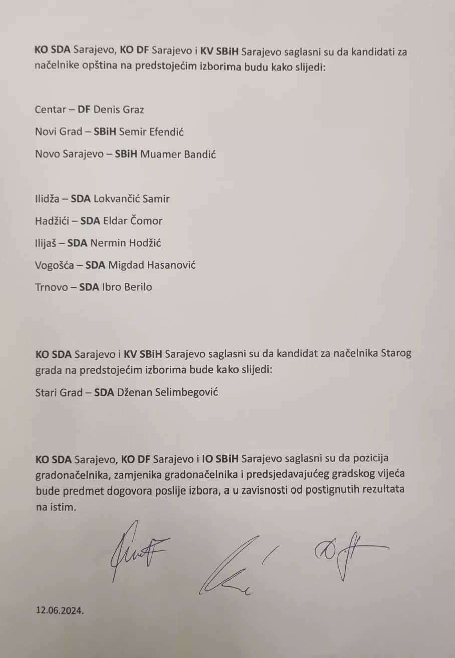 "Razgovori su vođeni na nivou kantonalnih organizacija tri stranke i ono što je dogovoreno parafirano je 12. juna 2024. između tri predsjednika - Almira Bečarevića, Faruka Kapidžića i Albina Zuhrića, te taj dokument objavljujemo isključivo zbog pokušaja manipulacije jedne od općinskih organizacija koja se svakako nije pridržavala postignutog dogovora.