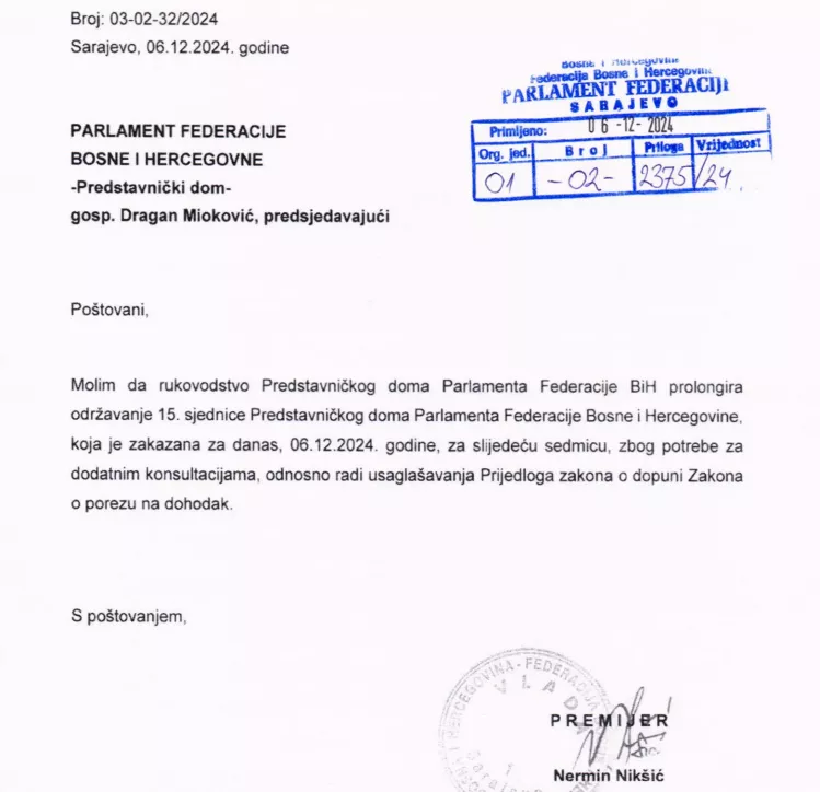 U dopisu koji je Nikšić uputio predsjedavajućem Predstavničkog doma FBiH Draganu Miokoviću, između ostalog kaže se: "Molim da rukovodstvo Predstavničkog doma Parlamenta FBiH prolongira za danas zakazanu sjednicu za sljedeću sedmicu, zbog potrebe za dodatnim konsultacijama, odnosno radi usaglašavanja Prijedloga zakona o dopuni Zakona o porezu na dohodak".