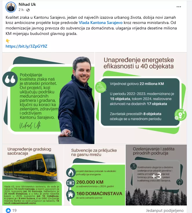 No, premijer Uk čuo je instrukciju svog šefa, pa je danas odlučio javnost 'počastiti' objavama postignuća u borbi za čist zrak uz šarene ilustracije i nezaobilazni žuti tramvaj. No, nažalost Sarajevo je i u ovoj revoluciji jedan od gradova sa najzagađenijim zrakom na svijetu.