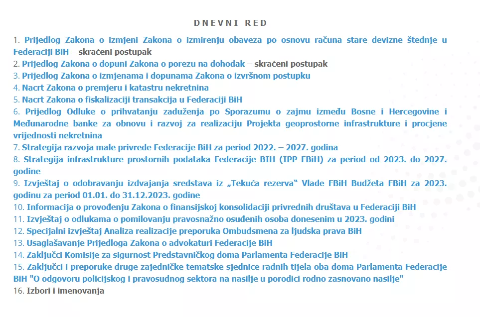 (Patria) - Predsjedavajući Predstavničkog doma Parlamenta FBiH Dragan Mioković obavijestio je zastupnike da će se 15. redovna sjednica ovog doma održati u četvrtak, 12.12.2024. godine s početkom u 10 sati, sa istim prijedlogom dnevnog reda za koji su zastupnici već dobili materijal.