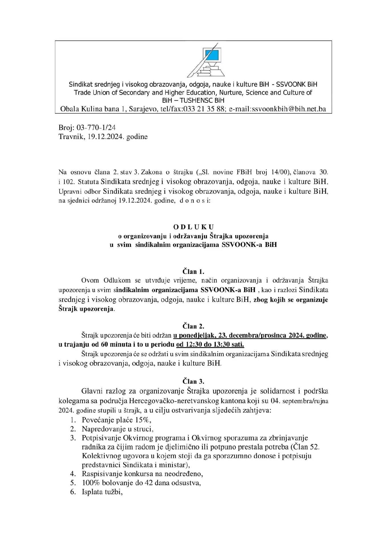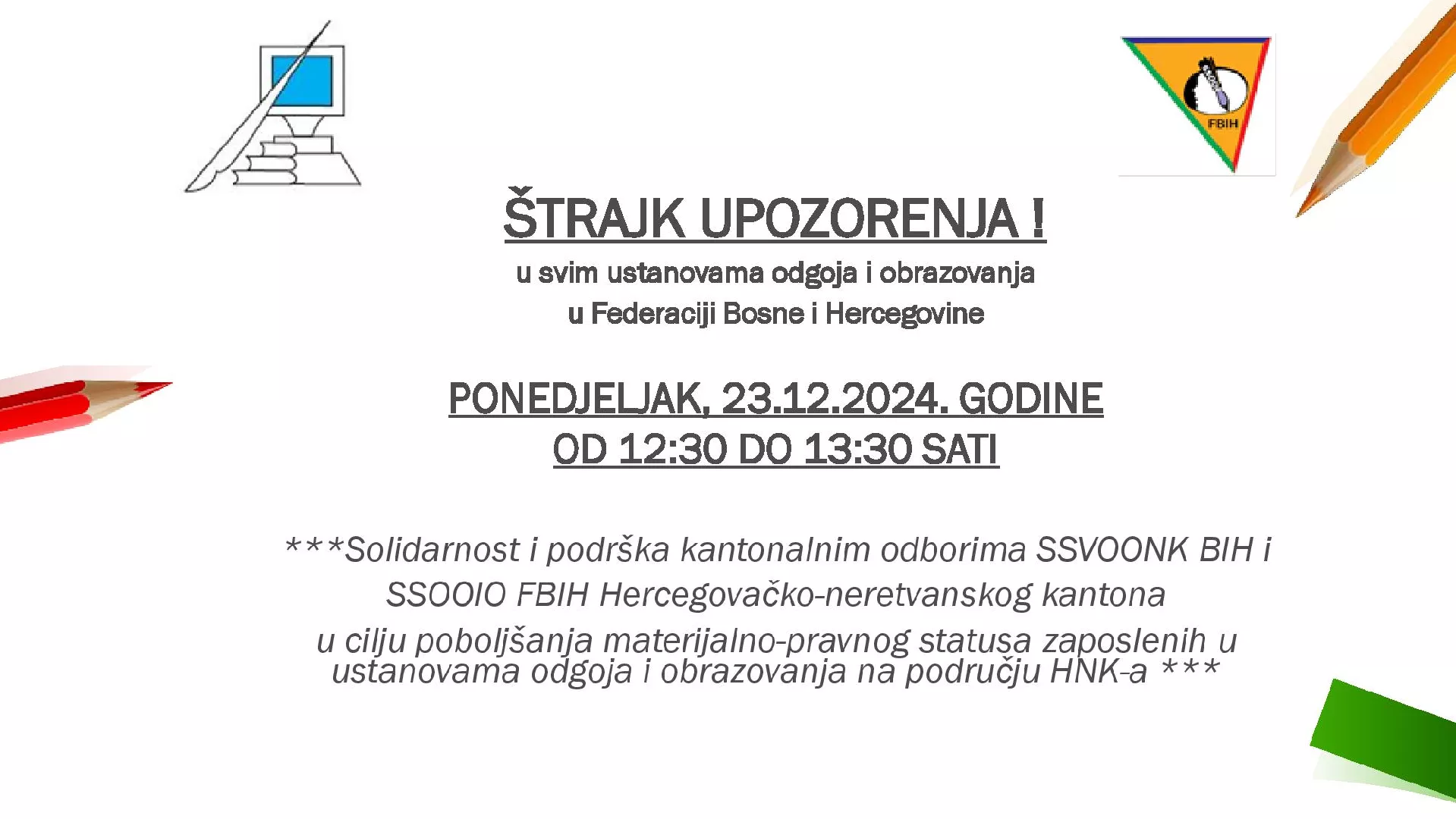 (Patria) - U ponedjeljak od 12:30 do 13:30 u svim sindikalnim organizacijama Sindikata srednjeg i visokog obrazovanja, odgoja, nauke i kulture BiH bit će održan jednosatni štrajk upozorenja.