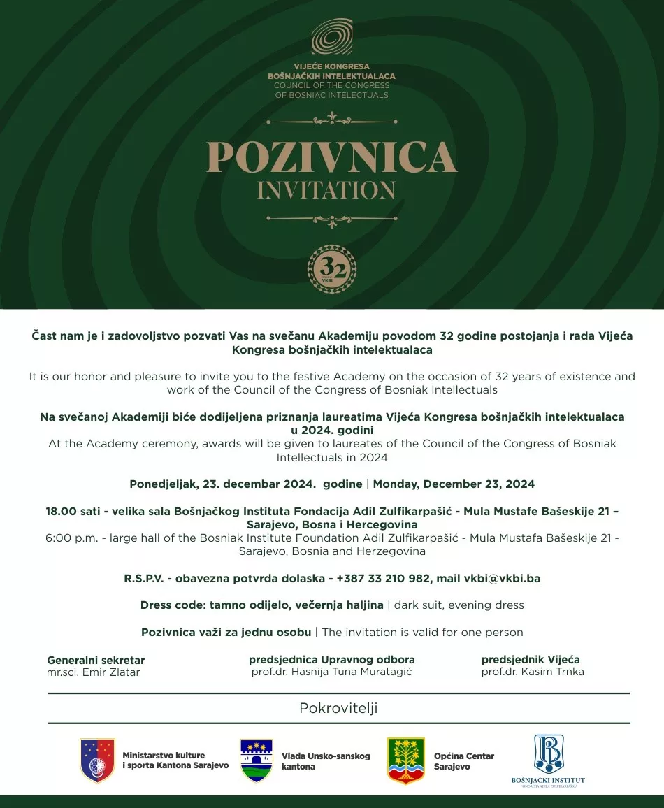(Patria) - U velikoj sali Bošnjačkog Instituta Fondacija Adil Zulfikarpašić večeras će, s početkom u 18.00 sati, biti upriličena Svečana akademija povodom 32 godine od osnivanja Vijeća Kongresa bošnjačkih intelektualaca (VKBI).