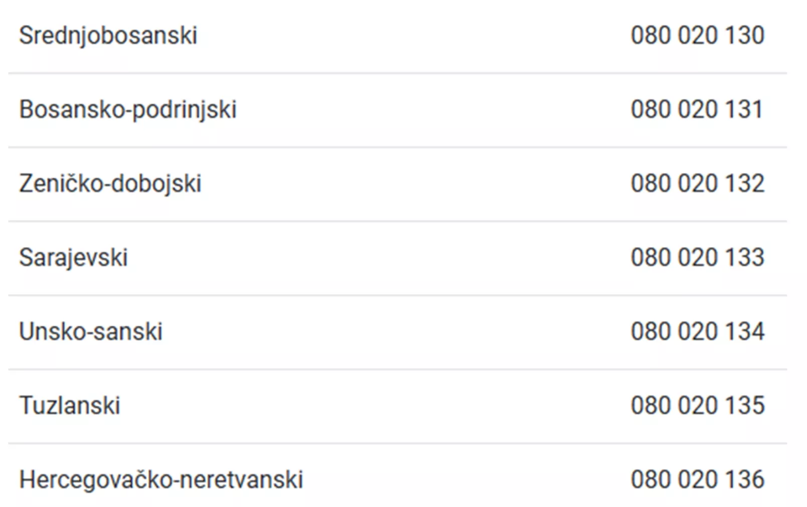 Besplatni brojevi podružnica Distribucije po kantonima: