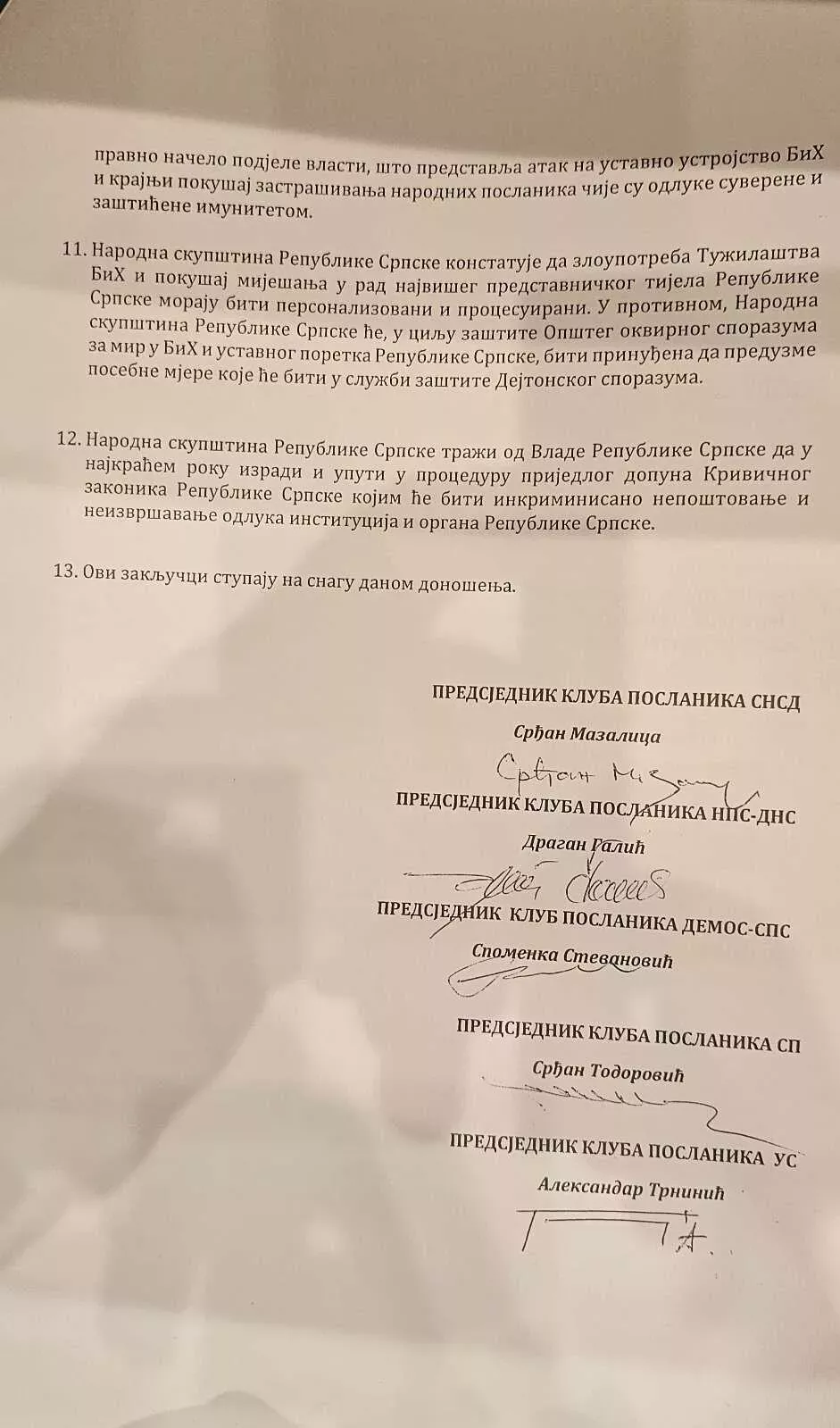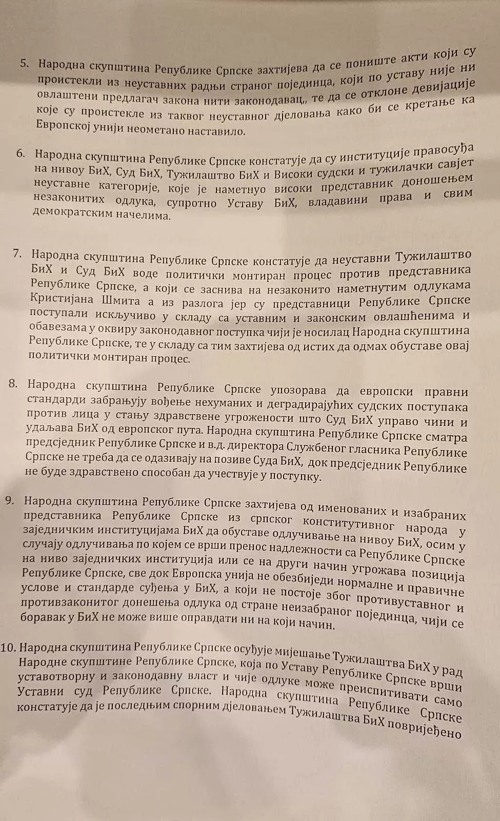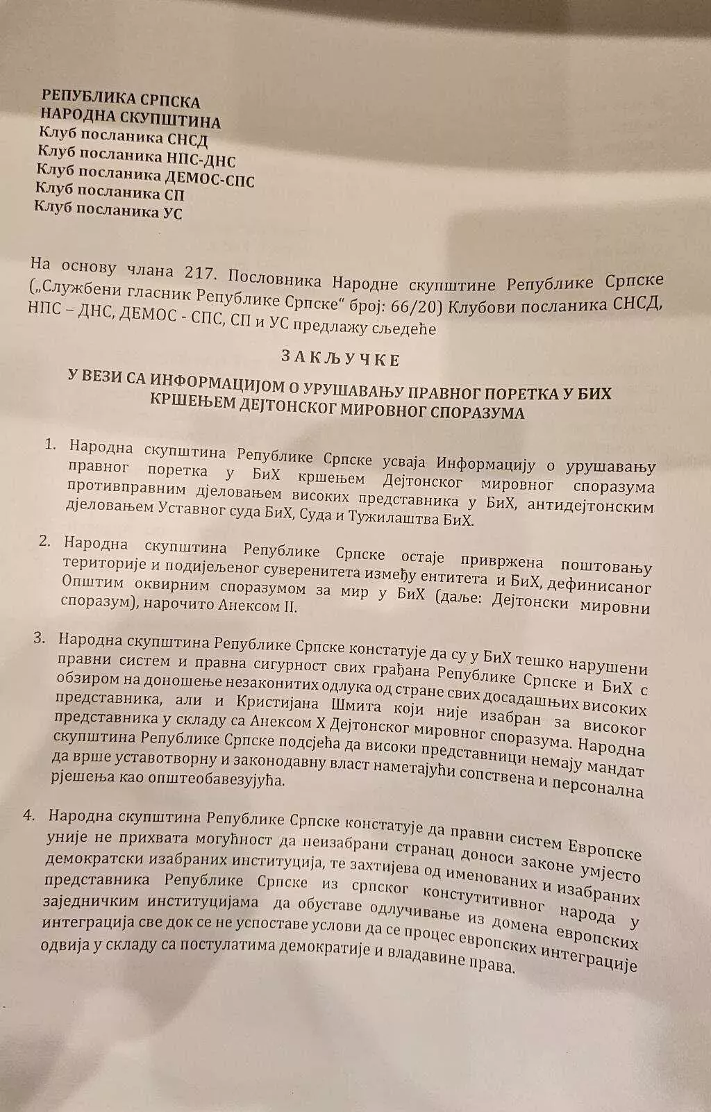 Riječ je o 13 zaključaka koje je predložila vladajuća većina u Rs. Kako se navodi NSRs ostaje privržena poštivanju teritorije i podijeljenom suverenitetu između entiteta i BiH.