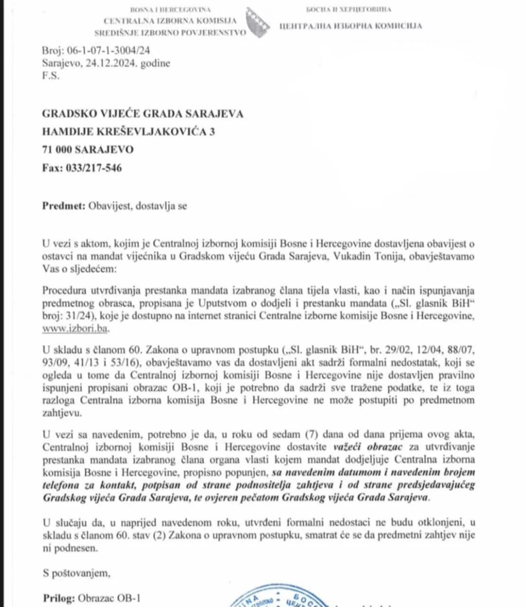 Iz CIK-a je Gradskom vijeću Sarajeva 24. decembra stigao dopis kojim ih obavještavaju da akt koji je dostavio Vukadin ima formalni nedostatak te da nije dostavljen pravilno ispunjeni obrazac OB-1 koji je potrebno da sadrži sve podatke te CIK ne može postupiti po predmetnom zahtjevu.