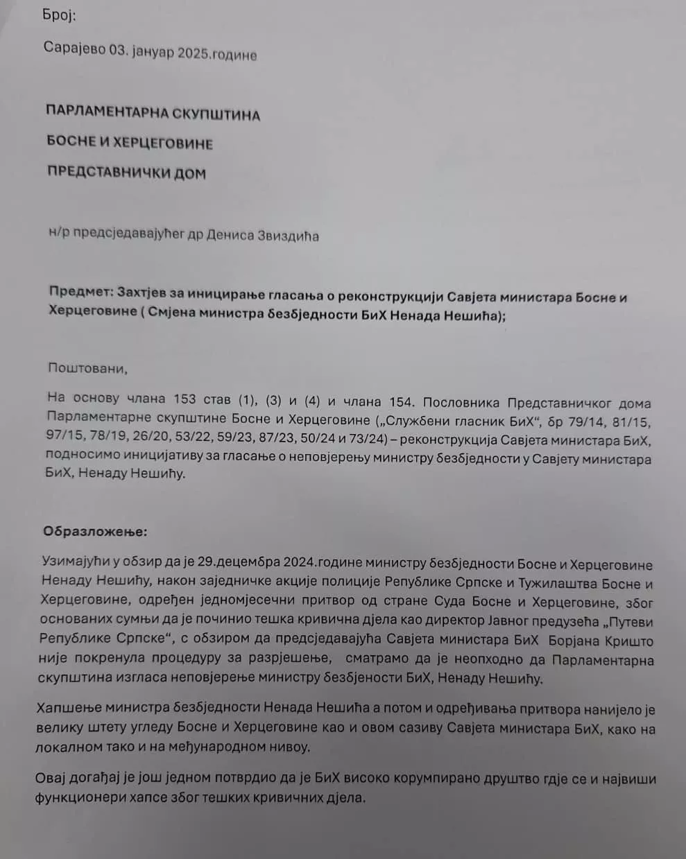 "Nakon zaјedničke akciјe policiјe Rs i Tužilaštva BiH, te potvrđenih јavnih saznanja o visokoј korupciјi i određivanja pritvora za ministra sigurnosti u Vijeću ministara BiH, pokrenuta јe zastupnička iniciјativa za smјenu ministra Nešića.
