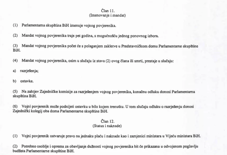 Zakon o parlamentarnom vojnom povjereniku precizira izbor vojnog povjerenika, a bira ga Parlamentarna skupština BiH na prijedlog Zajedničke komisije za odbranu i sigurnost, a kandidate predlažu kako članovi Komisije, tako i poslanički odnosno klubovi naroda iz oba doma PS BiH.