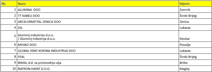 Najveći izvoznik za 2024. godinu bila je kompanija Alumina iz Zvornika, koja je s prve pozicije svrgnula ArcelorMittal Zenica, koji je pao na poziciju broj 3.