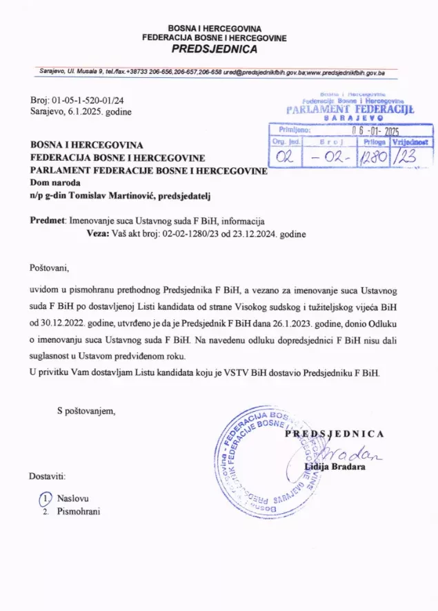 (Patria) - Predsjednica FBiH Lidija Bradara dostavila je Domu naroda FBiH listu kandidata za izbor sudije Ustavnog suda FBiH staru više od dvije godine, iz vremena mandata bivšeg predsjednika FBiH Marinka Čavare, na kojoj se nalazi Monika Mijić, trenutna v.d. agentica BiH pred Evropskim sudom za ljudska prava u Strazburu.