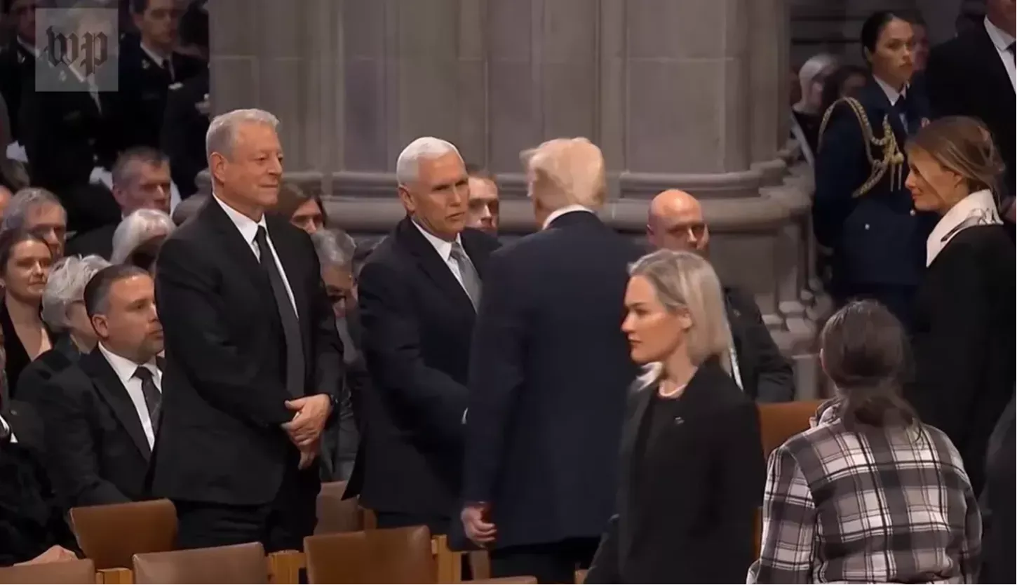 Bivši potpredsjednik Al Gore sjedio je pored Pencea. Kada je Trump ušao u red gdje je sjedio uoči sahrane, Gore je ustao i rukovao se s njim, a zatim je Pence ustao. Trump je pružio ruku Penceu.
