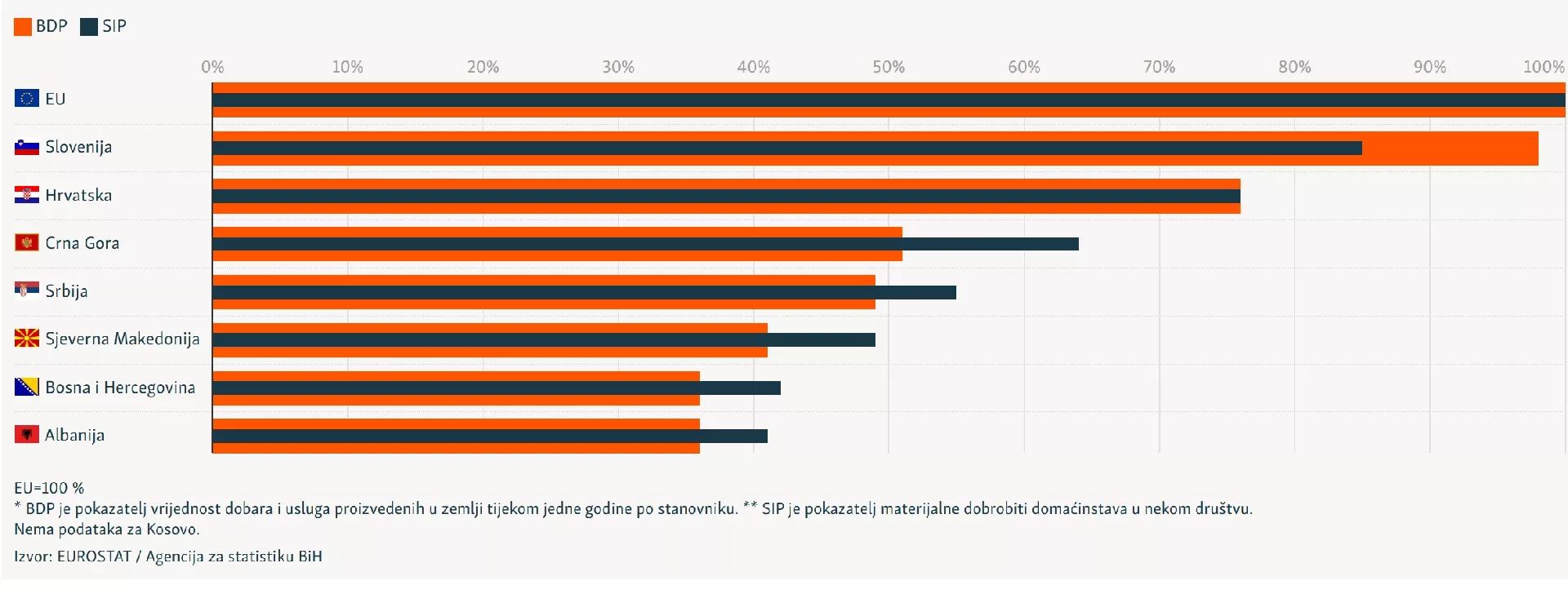 Bruto domaći proizvod (BDP) po stanovniku u Bosni i Hercegovini i Albaniji iznosi tek 36 posto prosječnog BDP-a u Evropi.