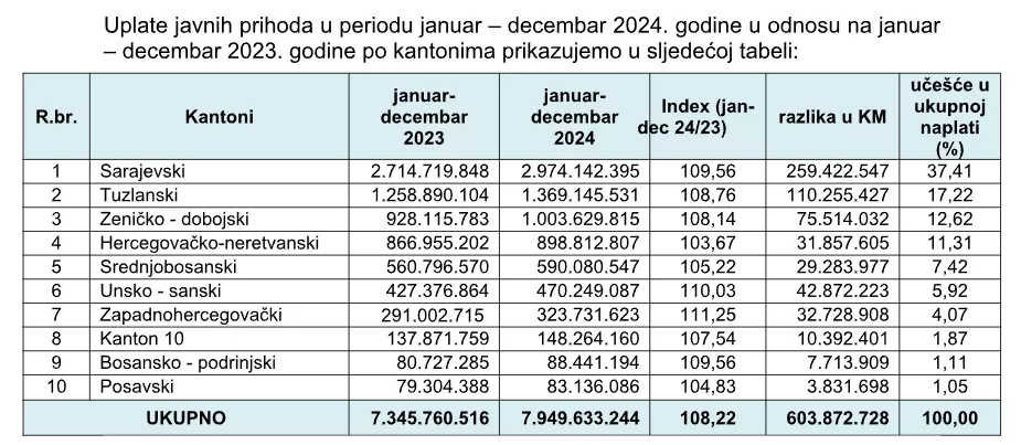 (Patria) - Porezna uprava Federacije BiH obavještava javnost da je naplata javnih prihoda u prošloj godini imala trend rasta i da su porezni obveznici Federacije BiH u periodu januar – decembar 2024. godine uplatili rekordnih 7.949.633.244 KM javnih prihoda, što je u odnosu na januar – decembar 2023. godine više za 603.872.728 KM, ili za 8,22%.