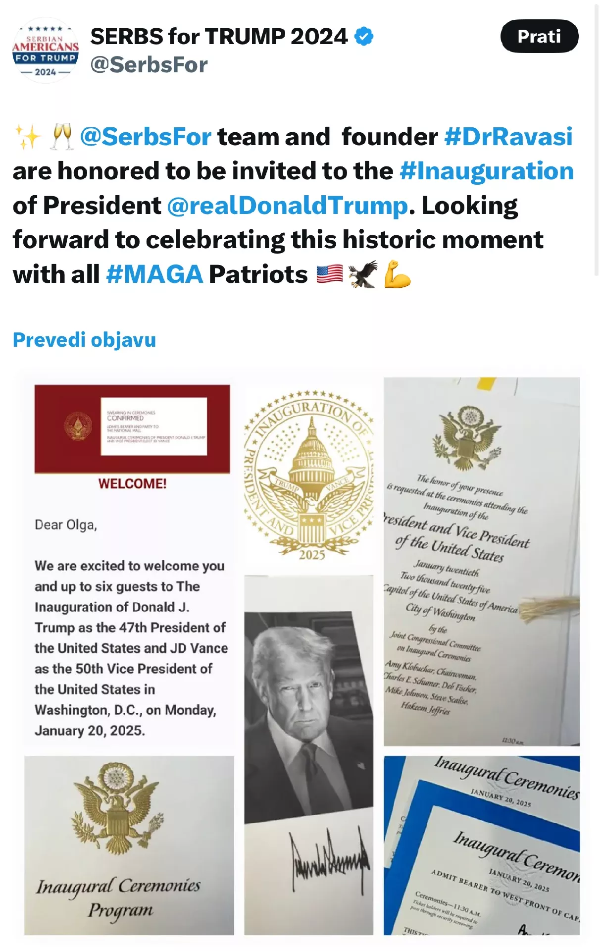 “Uzbuđeni smo što ćemo vas i do šest gostiju dočekati na inauguraciji Donalda Trampa kao 47. predsjednika SAD i DŽej Di Vensa kao 50. potpredsjednika SAD u Vašingtonu u ponedeljak, 20. januara”, piše u pozivnici upućenoj Olgi Ravasi.