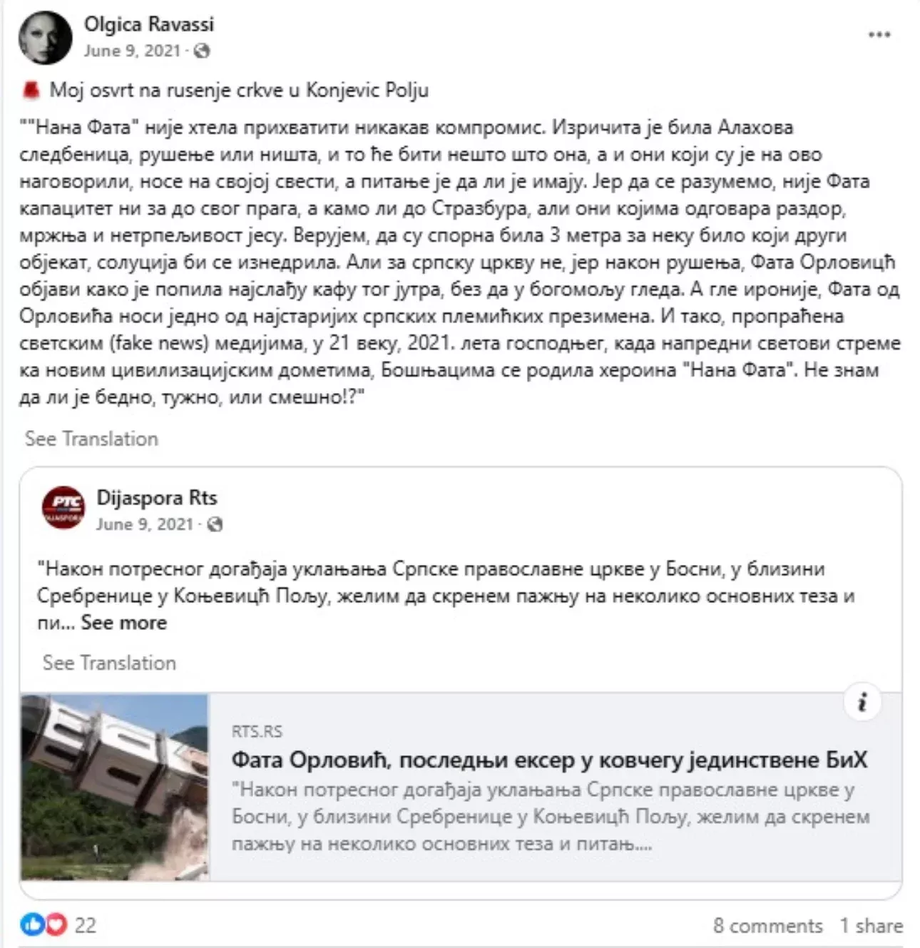 U junu 2021. godine Olga Ravasi je iznosila skandalozne stavove i u vezi sa rušenje crkve u dvorištu Fate Orlović u Konjević Polju.