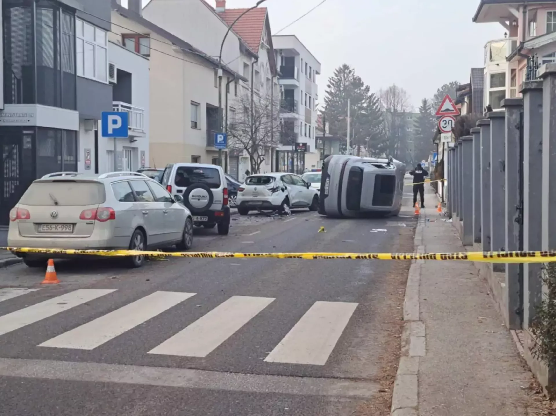 Prema fotografiji koju je zabilježila ekipa Patrije, na licu mjesta su dva oštećena automobila, a došlo je i do saobraćajne nesreće barem sudeći prema oštećenjima na vozilima. A jedno vozilo je prevrnuto.