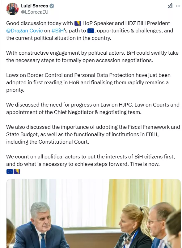 Računamo na sve političke aktere da će interese građana BiH staviti na prvo mjesto, te učiniti ono što je potrebno da se postižu koraci naprijed. Vrijeme je sada", navedeno je u objavi Sorece.