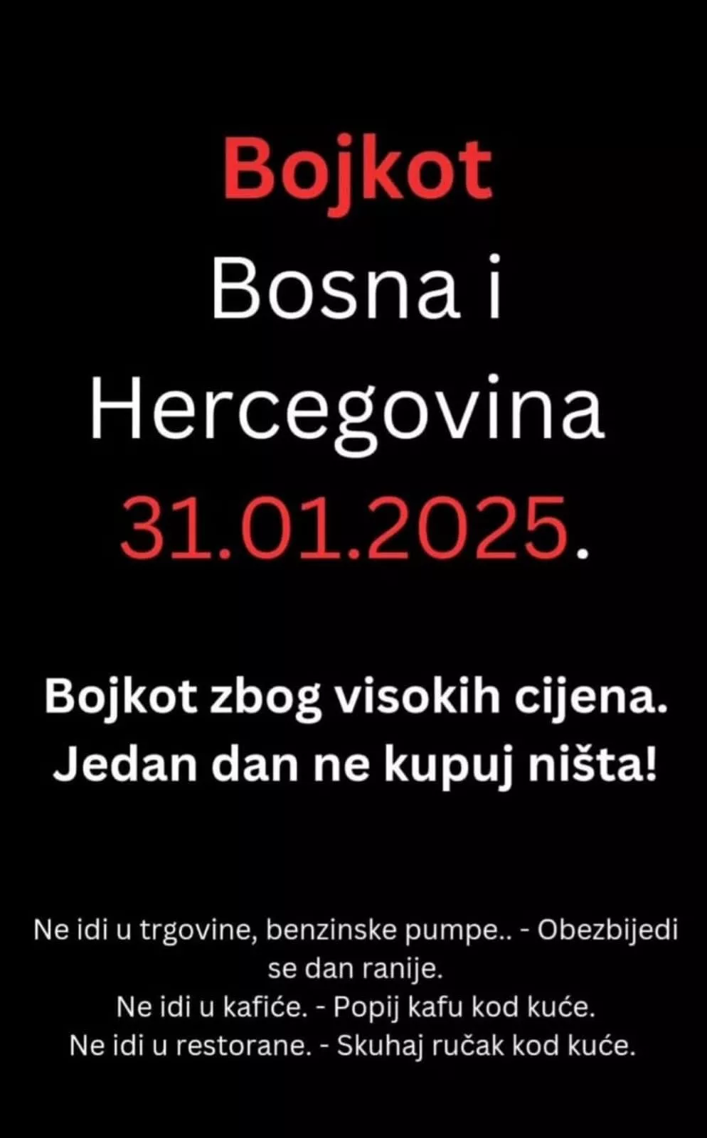 Kao datum kada bi Bosanci i Hercegovci bojkotom mogli izraziti svoje nezadovoljstvo zbog visokih cijena i niskog životnog standarda navodi se petak, 31. januar.