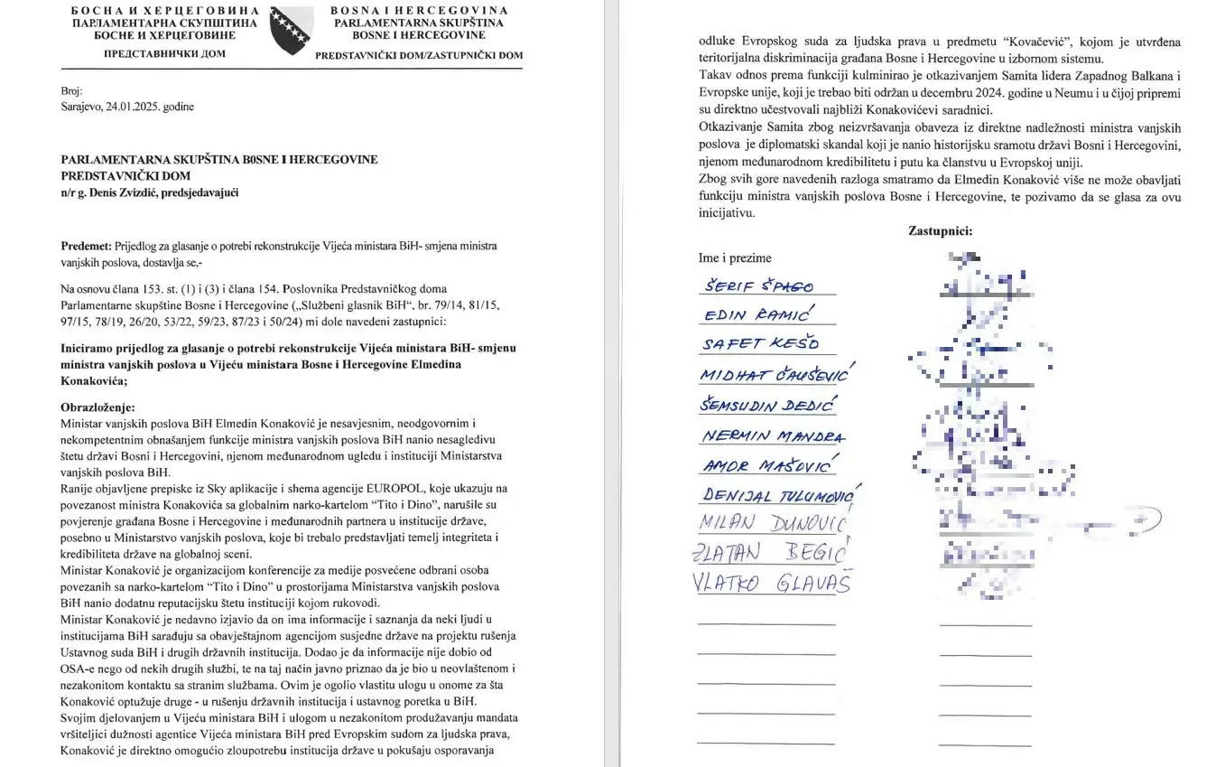 U obrazloženju inicijative, između ostalog, navedeno je kako je državi BiH nanesena nesaglediva šteta na međunarodnom planu zbog povezanosti ministra Konakovića sa osobama iz narkokartela "Tito i Dino", a što dokazuju prepiske iz Sky aplikacije i shema agencije Europol, saopćeno je iz Kluba zastupnika SDA u Zastupničkom domu Parlamentarne skupštine Bosne i Hercegovine.