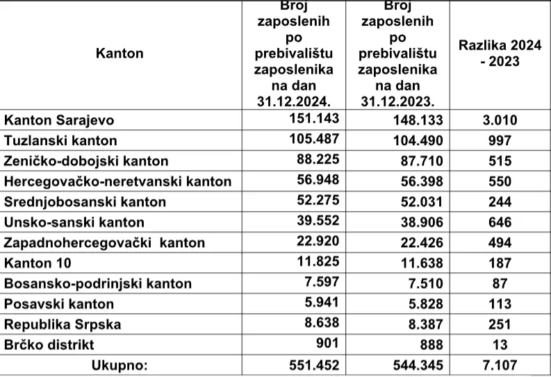 Prema podacima Porezne uprave FBiH 31.12.2024. godine u Federaciji BiH je bilo 551.452 zaposlene osobe.