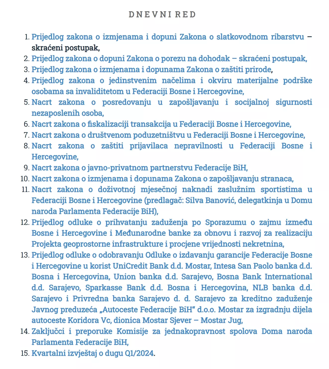 (Patria) - U Sarajevu će danas, sa početkom u 12.00 sati, biti održana 15. redovna sjednica Doma naroda Parlamenta Federacije BiH. Na dnevnom redu je ukupno 15 tačaka.