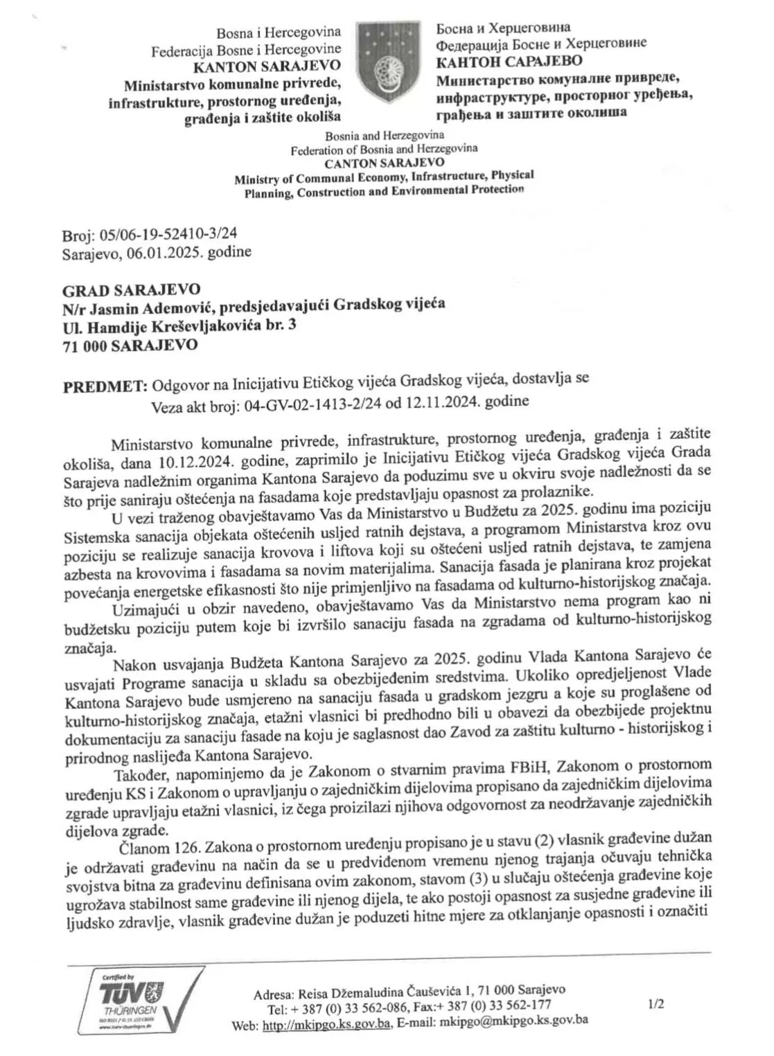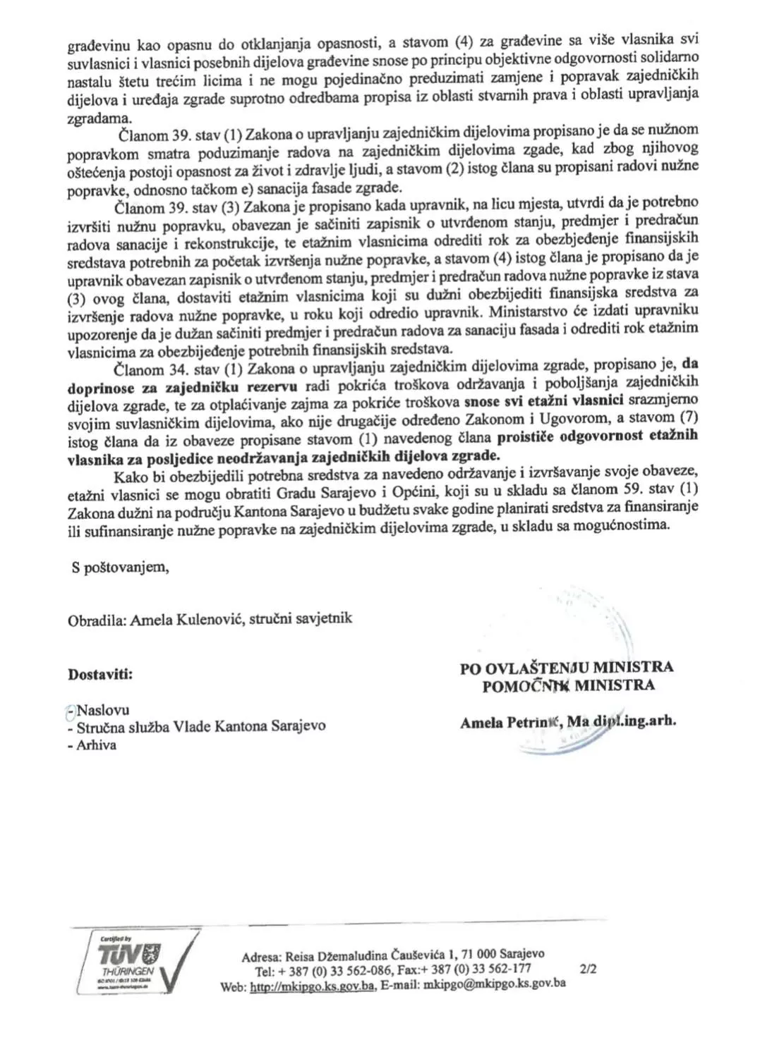 U dopisu upućenom Gradskom vijeću, Ministarstvo je naglasilo da zakon propisuje obavezu etažnih vlasnika da održavaju zajedničke dijelove zgrada, uključujući fasade, te da su oni dužni osigurati potrebna sredstva za sanaciju.