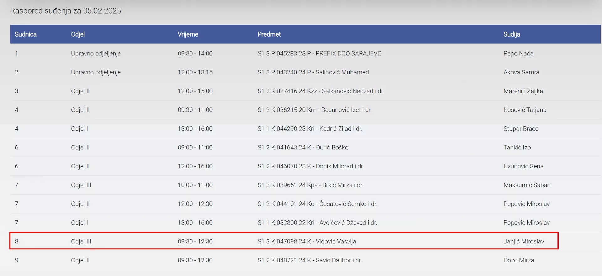 Prema rasporedu suđenja, objavljenom na web stranici Suda BiH, izricanje prvostepene presude u predmetu "S1 3 K 047098 24 K - Vidović Vasvija", zakazano je s početkom u 9.30 sati.