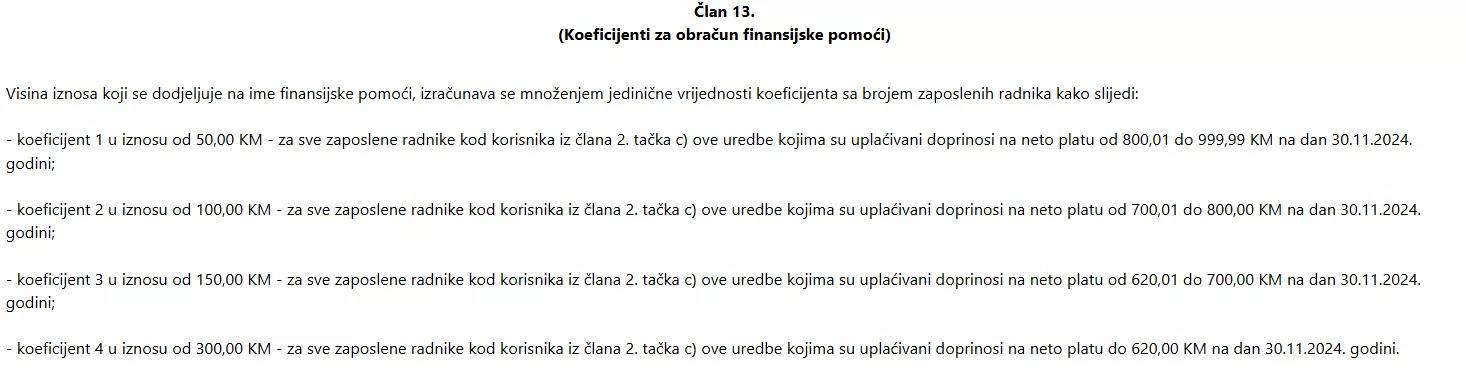 Sredstva finansijske pomoći po ovoj uredbi koristit će se za refundaciju isplaćenog dijela doprinosa za broj radnika koji je korisnik imao zaključno sa 30.11.2024. godine, a koji su imali neto platu manju od 1.000,00 KM i koji imaju kontinuitet u prijavi osiguranja radnika tokom 2025. godine.