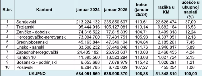 (Patria) - Porezna uprava Federacije BiH obavještava javnost da su porezni obveznici Federacije BiH u januaru 2025. godine uplatili 635.900.370 KM javnih prihoda, što je u odnosu na januar 2024. godine više za 51.848.810 KM, ili za 8,8%. Uplate javnih prihoda januaru 2025. godine u odnosu na januar 2024. godine po kantonima prikazujemo u sljedećoj tabeli: