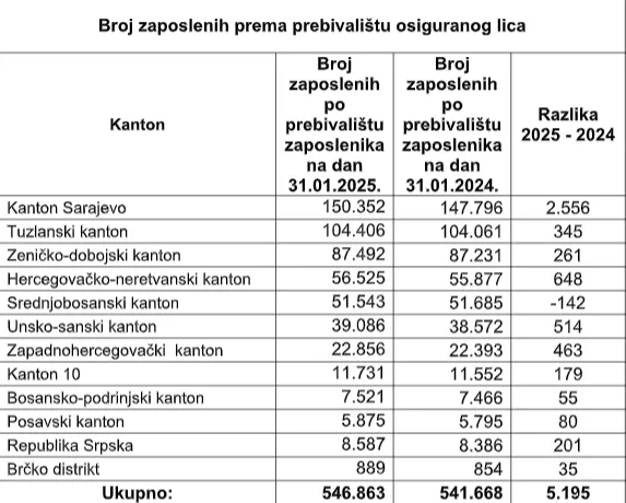 Broj zaposlenih prema prebivalištu zaposlenika na dan 31.1.2025. godine je