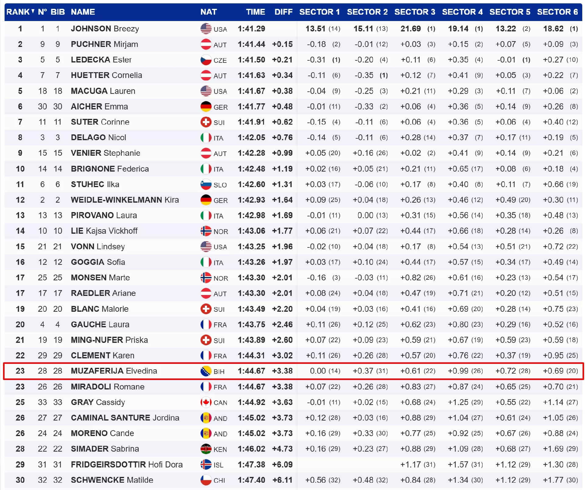 Imala je zaostatak za vodećom 3.38 (vrijeme 1:44.67) što je u tom trenutku bilo dovoljno za 21. mjesto. No, na kraju je izgubila još dva mjesta i završila na 23. mjestu, piše Faktor.