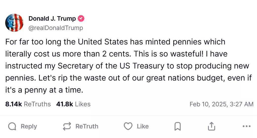 Naložio sam ministru finansija da prestane s proizvodnjom novih penija. Uklonimo rasipanje iz budžeta naše velike nacije, čak i ako je to jedan po jedan peni", naveo je Trump.