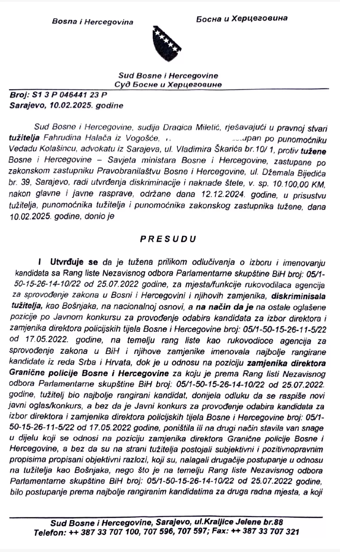 “Utvrduje se da je tužena (Bosna i Hercegovina, Vijeće ministara BiH) prilikom odlučivanja o izboru i imenovanju kandidata sa Rang liste Nezavisnog odbora Parlamentarne skupštine BiH broj: 05/1-50-15-26-14-10/22 od 25.07.2022 godine, za mjesta/funkcije rukovodilaca agencija za sprovodenje zakona u Bosni i Hercegovini i njihovih zamjenika, diskriminisala tužitelja (Fahrudin Halač), kao Bošnjaka, na nacionalnoj osnovi”, piše u izreci presude Suda Bosne i Hercegovine.