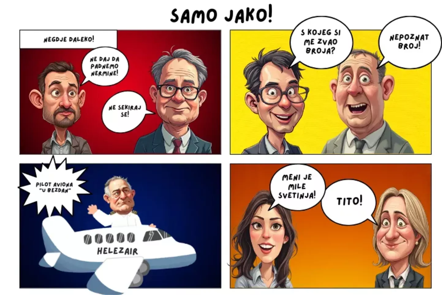 Konaković panično ponavlja “sve je ovo Bakirovo i onog Željka maslo!”, a Forto dok pokušava završiti neki evropski sendvič s duginim bojama odgovara: “ali ja nisam Bošnjak, nisam zaslužio ovo”. U samom repu aviona Nikšić se skupio i plače. “Onolike milijarde ostadoše u budžetu, sad ću zvati Vojina da vidim može li nam pomoći”. “Alo, gde si bre Neka, čujem frka, a”. “Vojine, pomozi brate”, ponavlja panični Nikšić. “Ne mogu, bre Neka, evo me s Miletom, on kaže da se mi Srbi sad moramo držati zajedno”.