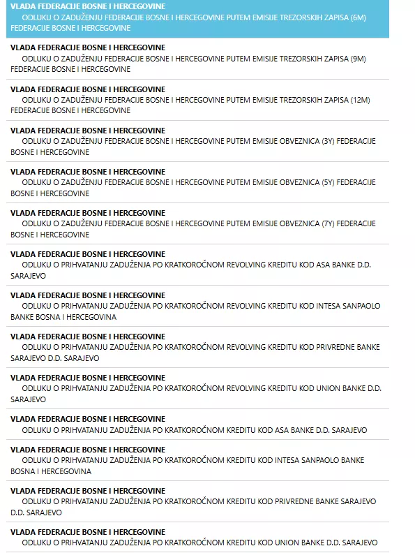 Vlada je donijela šest odluka o zaduženju putem emisije obveznica, u iznosu od 50 miliona KM sa rokom dospijeća u trajanju od tri godine, 40 miliona sa rokom dospijeća od 273 dana, 150 miliona KM sa rokom dospijeća od pet godina, 40 miliona KM, 120 miliona KM sa rokom dospijeća od 182 dana i 100 miliona KM sa rokom dospijeća od sedam godina.