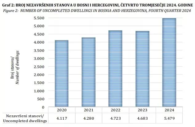 Broj nezavršenih stanova na kraju četvrtog tromjesečja 2024. godine je 5.479 i predstavlja rast za 17 posto u odnosu na isti period prošle godine.
