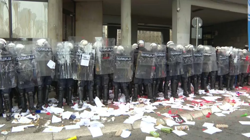 Jake policijske snage prisutne se od jutros ispred zgrade skuštine, a veliki broj studenata i građana gađao je policiju jogurtom, farbom, jajima.