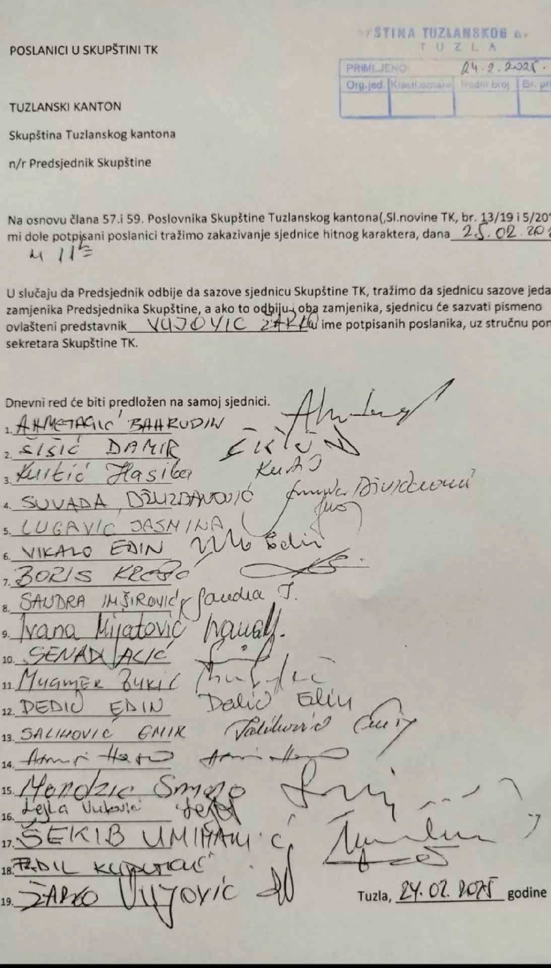 Ovih 19 zastupnika od rukovodstva Skupštine TK traže da se hitna sjednica održi u utorak 25. februara.